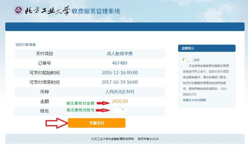 (3)核对姓名、金额等信息,确认信息无误后,点击【全额支付】,显示如下界面: