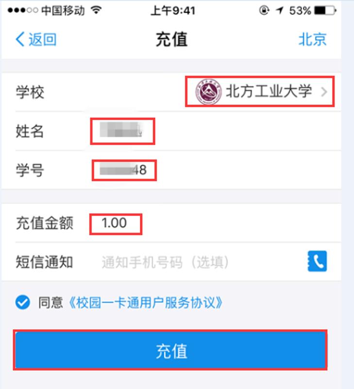 4、选择【学校】,填写【姓名】、【学号】、【充值金额】,点击【充值】