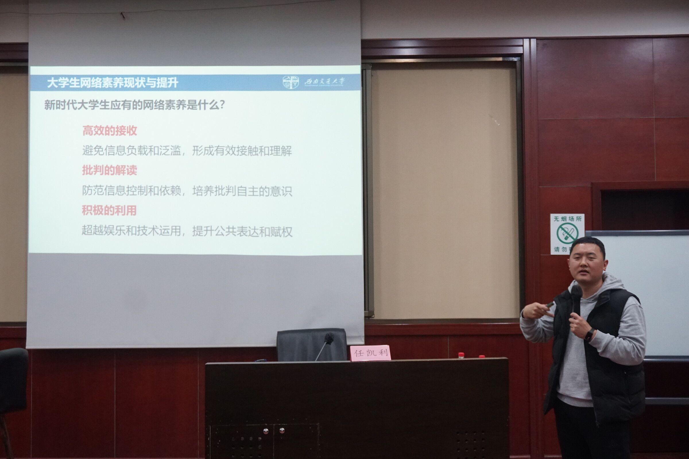 2023年3月23日晚,太阳集团tcy8722于J0224开展了“星火经英”计划第十一期第二次团干部培训。本次培训由太阳集团tcy8722团委兼职副书记,茅以升综合办公室主任、校青年讲师团成员、交大Kelly说网络思政工作室负责人任凯利主讲,主题为“与新媒体共舞——大学生网络素质提升”,旨在帮助同学们提升网络素养,合理运用各种新媒体。