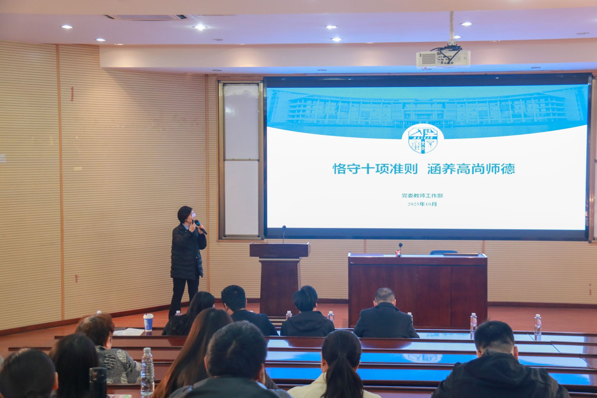 会上,蒋佳带领全体教职工重温了《新时代高校教师职业行为十项准则》,明确教师在教育教学、学术研究等方面的行为规范,并做警示教育,进一步筑牢思想防线。