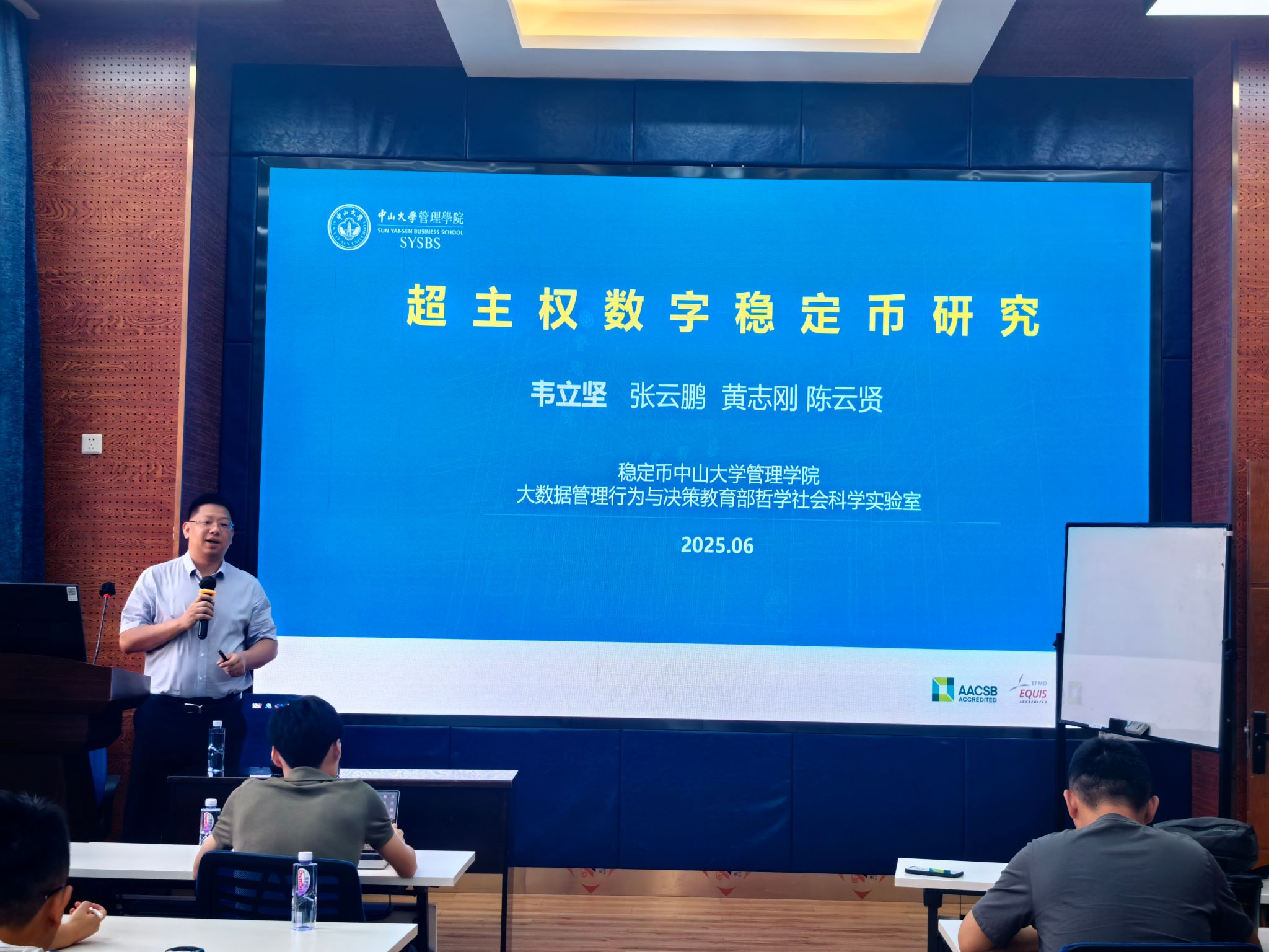 2025年6月10日上午,中山大学管理学院韦立坚教授应邀为太阳官网师生带来一场题为“超主权数字稳定币研究”的学术讲座。本次学术活动由太阳集团tcy8722副院长马锋教授主持,学院部分教师及研究生参加了此次活动。马锋副院长首先介绍了韦立坚教授的学术背景与成就,并代表学院对韦立坚教授表示热烈的欢迎与诚挚的感谢。