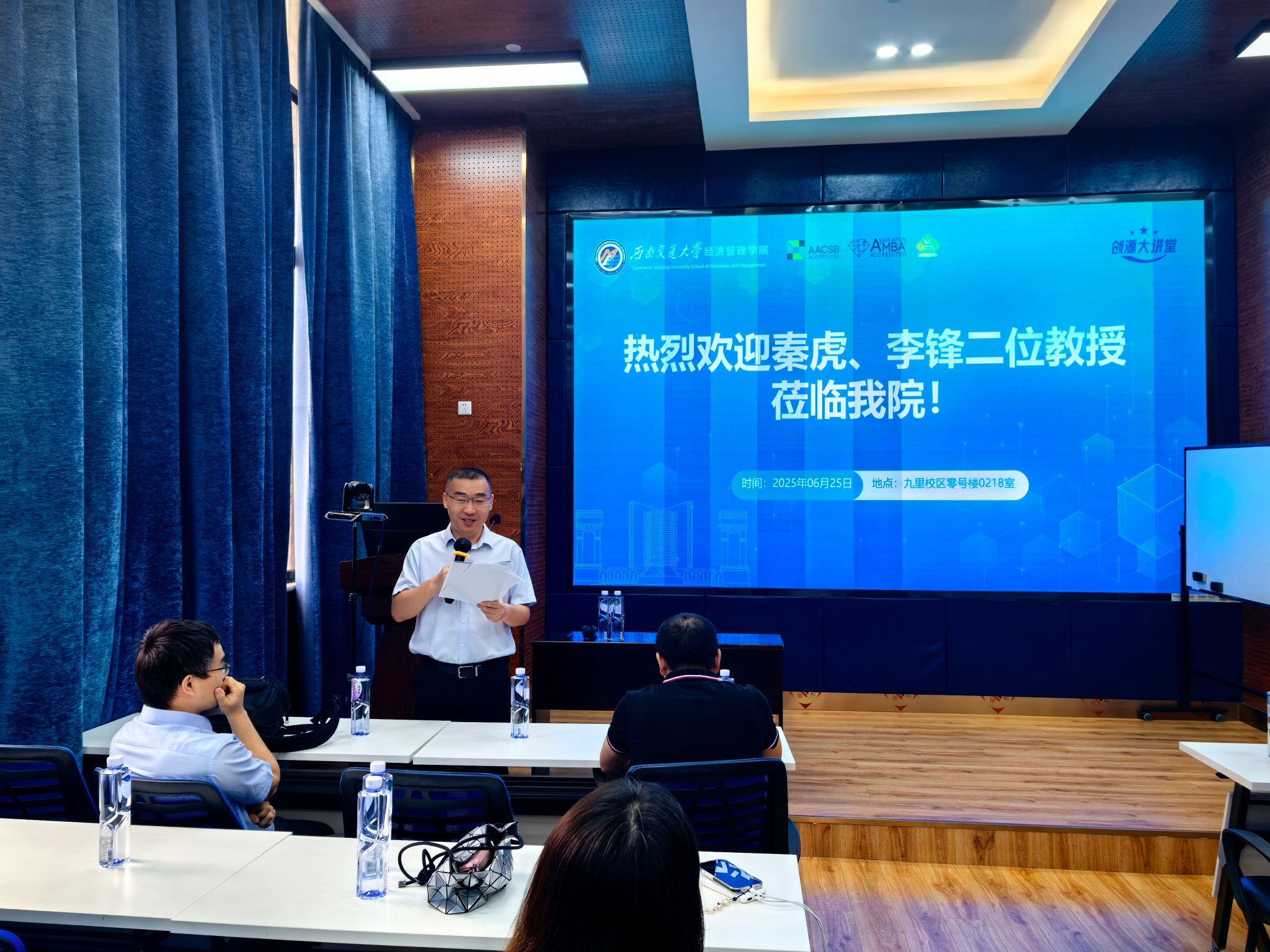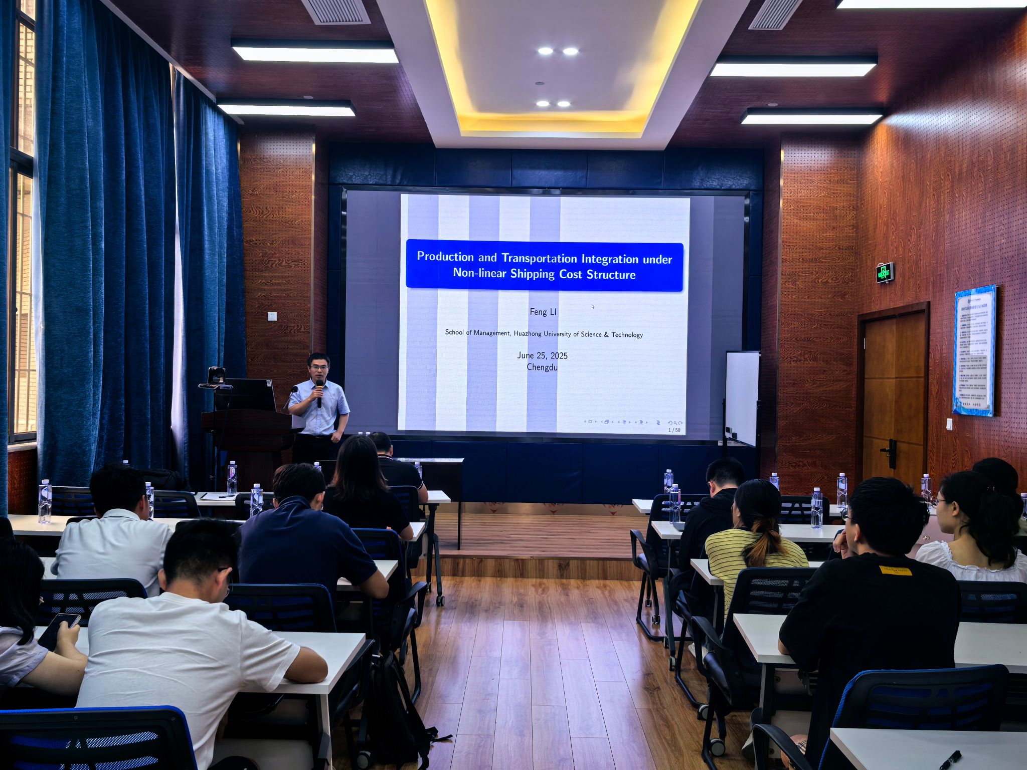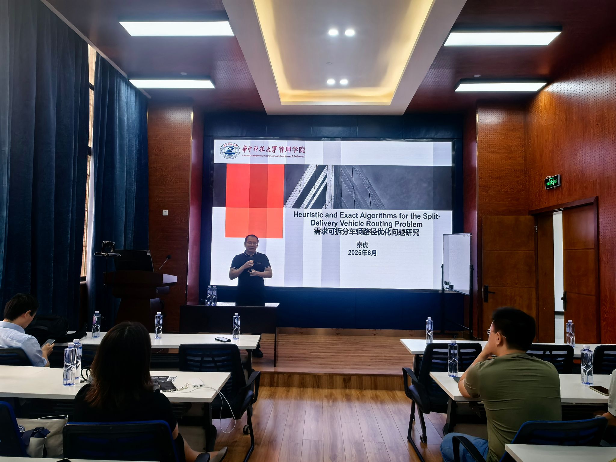 2025年6月25日上午,华中科技大学管理学院秦虎教授和李锋教授应邀莅临太阳官网,分别做题为“需求可拆分车辆路径优化问题研究”和“Production and Transportation Integration Problem”的学术讲座。本次讲座由太阳集团tcy8722副院长聂佳佳教授主持,学院部分教师及研究生积极参加,现场学术氛围浓厚。讲座开始前,聂佳佳副院长简要介绍了秦虎教授和李锋教授的学术背景与研究成果,对两位教授的到来表示热烈欢迎和诚挚感谢。