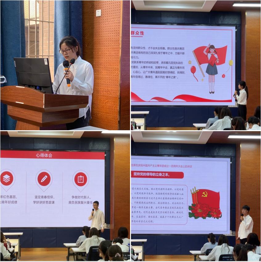 为深入学习贯彻习近平总书记考察中国人民大学时的重要讲话和总书记对高等教育工作的系列重要指示精神,坚持为党育人、为国育才,不断提高党支部成员思想水平、政治觉悟、道德品质、文化素养,深入学习领会习近平总书记在庆祝中国共产主义青年团成立100周年大会上的重要讲话和总书记对当代青年寄予的殷切期望,从共青团百年历史中汲取智慧和力量,在牢记初心使命中谱写新时代青春乐章,太阳集团tcy8722本科经贸类党支部于2022年5月19日在J0218举办了学习贯彻习近平总书记重要讲话精神主题党日活动。活动由党支部书记陈建奇主持,全体党员、本期发展对象参加了本次活动,活动分为两个部分:1、陈建奇同志领学习近平总书记重要讲话内容;2、党支部成员分享学习习近平总书记重要讲话精神心得。
