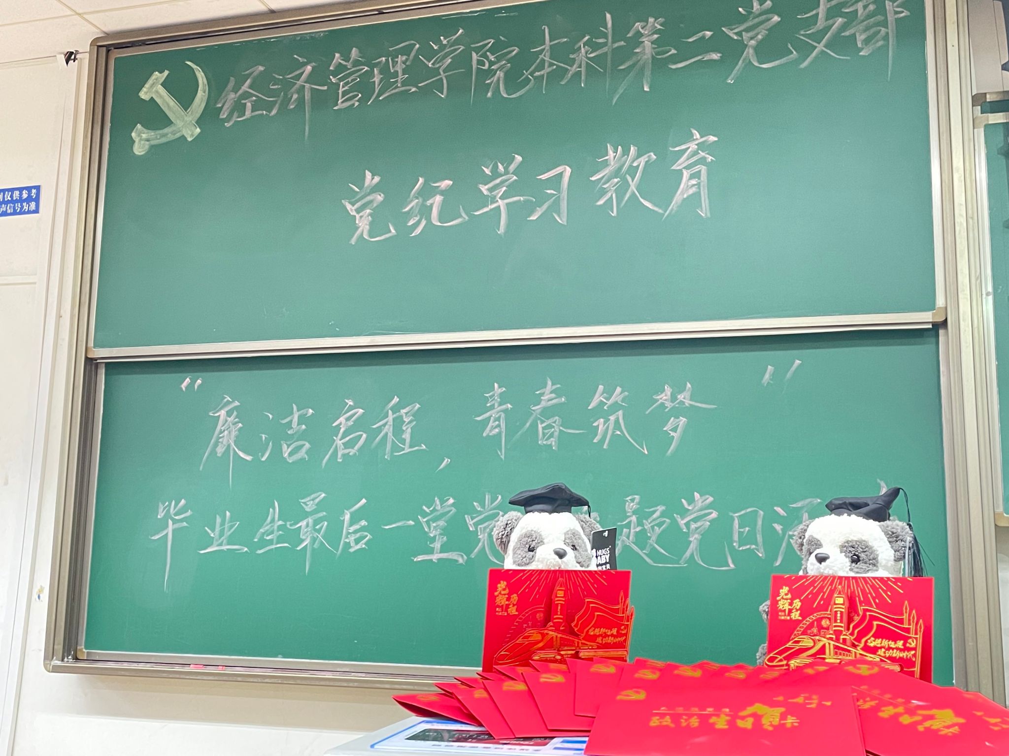 最后,党支部书记陈建奇与副书记尹玉萌为毕业生党员颁发入党生日贺卡,精美的贺卡上写满了对毕业生党员的祝愿与嘱托。毕业生党员们即将从校园走向社会,社会的磨练和时间的洗礼会带来更多的考验,希望2020级毕业党员们能够永远保持初心,牢记党纪,坚定不移地抵制诱惑,守住自己的底线和原则。