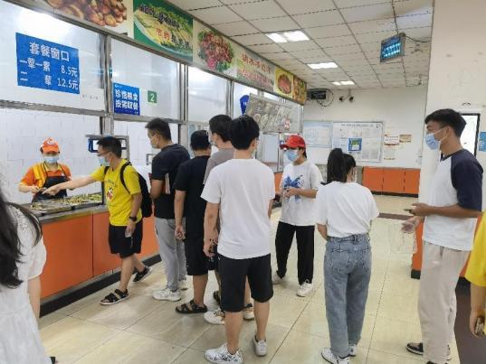 志愿者们身着志愿马甲积极投身各个服务岗位,“红色”身影遍布校园每个角落。他们在核酸检测点测量体温,维持队列秩序;他们在食堂门口提醒同学们佩戴好口罩,为同学们排忧解惑;他们在食堂内维持排队秩序,并主动帮同学们打包餐盒。